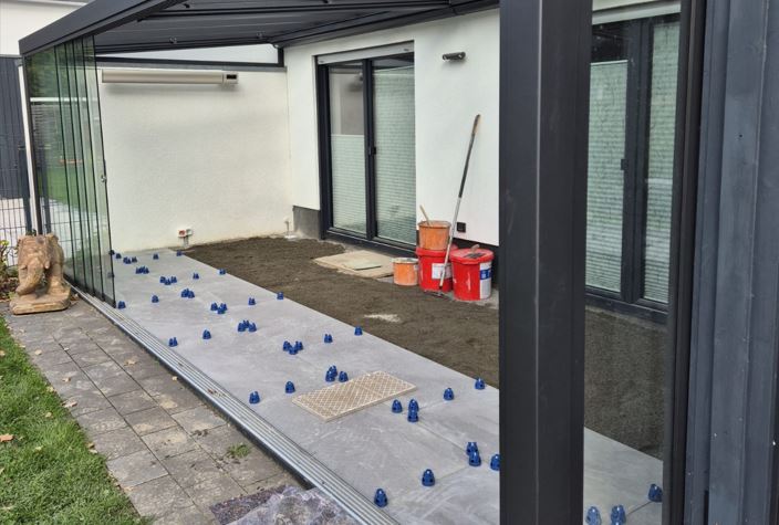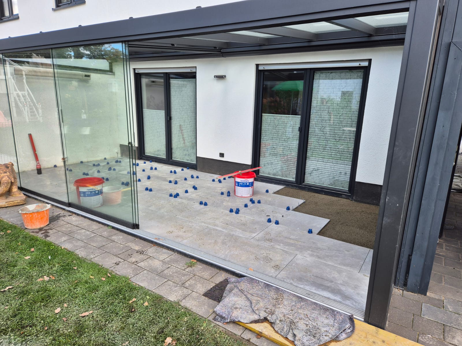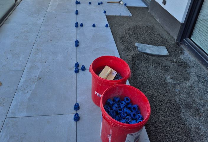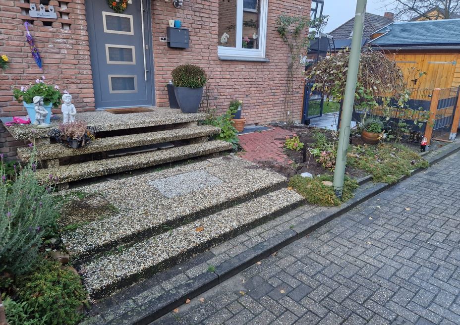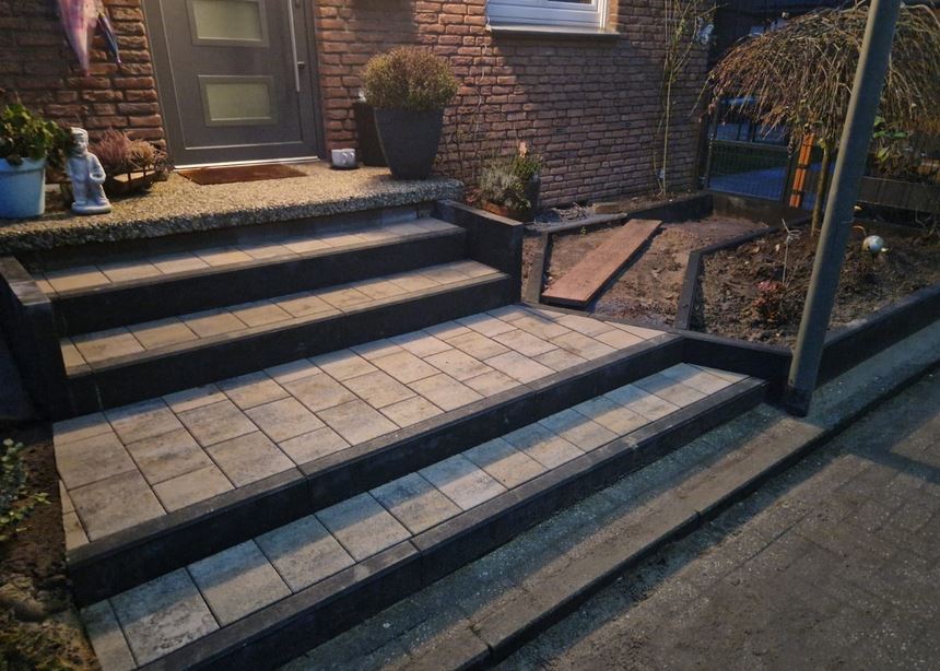 das professionelle Verlegen von Steinen oder Platten (aus Beton, Naturstein etc.) für Flächen wie Wege, Terrassen oder Einfahrten, wobei der Prozess das Ebnen, den Aufbau von Frost- und Tragschichten, das Setzen von Randsteinen, das Verlegen der Pflastersteine in einem Bett aus Splitt und das Verfugen umfasst, um langlebige, tragfähige und optisch ansprechende Oberflächen zu schaffen.